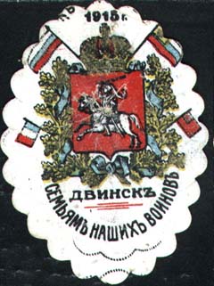 1915 1915 г. Виньетка в форме овала разм. 40 х 54 мм с фигурными краями. Многоцветная печать на желтоватой бумаге с мелованным верхним слоем. В центре герб Витебской губернии и флаги Рос-сии, Англии и Франции. Сверху текст в две строки: «К Пасхе 1915 г.». Внизу текст в две строки: «Двинск семьям наших воинов».