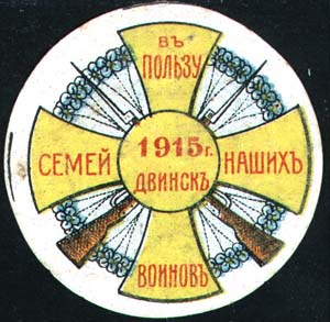 1915 1915 г. Круг диаметром 49 мм. Многоцветная печать на белой бумаге. В центре на фоне венка из цветов и скрещенных винтовок крест ополченца. На перекладинах креста текст: «В пользу семей наших воинов». В центре креста текст в две строки: «1915 г. Двинск».