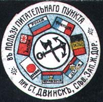 1915 1915(?) г. Круг диаметром 33 мм. Многоцветная печать на желтоватой бумаге с мелованным верхним слоем. В центре в круглой рамке путейский значок в обрамлении флагов стран-союзниц России в Первой мировой войне. По окружности с наружной стороны рамки текст: «В пользу питательного пункта при ст[анции]. Двинск, Сев[еро]. Зап[адной]. Ж[елезной]. Дор[оги].».