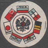 1916 1916 г. Круг диаметром 26,5 мм. Многоцветная печать на белой бумаге. На сплошном фоне из точек в круглой рамке диаметром 11 мм герб России. По окружности флаги стран-союзниц России в Первой мировой войне.