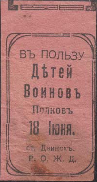 1916 1916(?) г. Разм. рамки 31 х 49 мм. Одноцветная печать на бледно-розовой бумаге. В двойной декоративной рамке в центре текст в семь строк: «В пользу детей Воинов Полков. 18 Июня. Ст[анция]. Двинск. Р.О.Ж.Д.».
