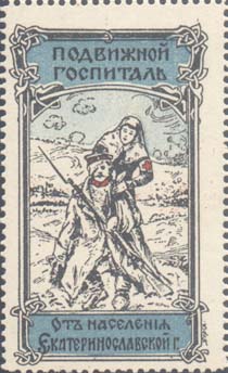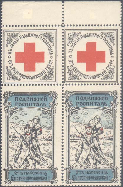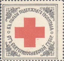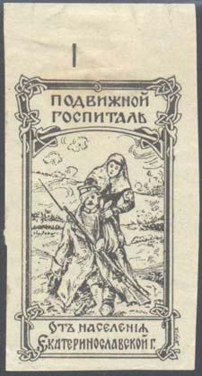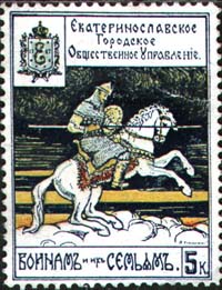 1914 1914 г. Разм. 30 х 40,5 мм. Многоцветная печать на белой бумаге. Зубц. 11 1/2. С клеем. В центре воин с копьем и щитом на коне. Сверху герб города и текст в три строки: «Екатеринославское Городское Общественное Управление». Внизу текст: «Воинам и их семьям».