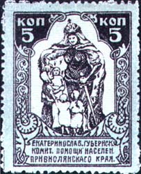 1914 1914 г. Разм. рамки 28 х 37 мм. Двухцветная печать на белой бумаге. Зубц. 12. В декоративной рамке в центре аллегорический рисунок «Мать Россия» ниже текст в три строки: «Екатеринослав[ский]. Губернск[ий]. Комит[ет]. помощи населен[ию]. Привислянского края».