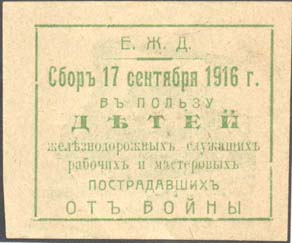 1916 1916 г. 17.09.1916 г. Всероссийский сбор. Разм. 49 х 41 мм. Одноцветная двухсторонняя печать на бумаге различных цветов. На лицевой стороне в прямоугольной рамке разм. 40 х 32 мм паровоз. На оборотной стороне в прямоугольной рамке разм. 40 х 32 мм текст в восемь строк: «Е.Ж.Д. Сбор 17 сентября 1916 г. в пользу детей железнодорожных служащих, рабочих и мастеровых, пострадавших от войны».