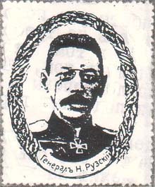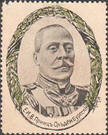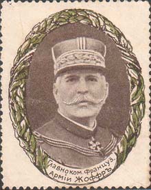 1914 1914(?) г. Разм. по перфорации 37 х 47 мм. Двухцветная печать на белой бумаге. Зубц. 11 1/2. В овальной декоративной рамке репродукция фотографий военных деятелей. Внизу подпись к портрету.
