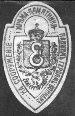 1916 1916(?) г. Ромб разм. ≈ 30 х 57 мм. Двухцветная печать на сероватой бумаге с мелованным верхним слоем. В двойной рамке в форме ромба разм. 26 х 49 мм центре герб г. Екатеринослава. По периметру между рамками текст: «На сооружение храма-памятника павшим героям-воинам в Екатеринославе».