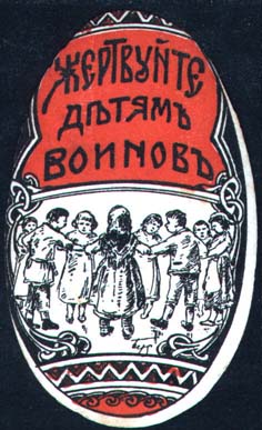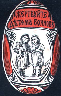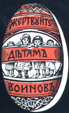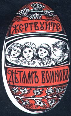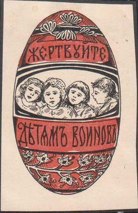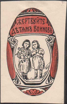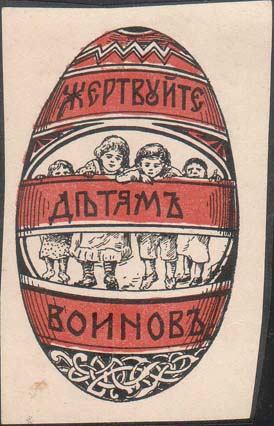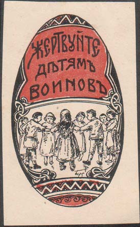 1915 1915(?) г. Виньетки в форме пасхальных яиц разм. 38 х 63 мм. Двухцветная печать на белой бумаге. В центре дети, орнамент и текст: «Жертвуйте детям воинов».