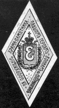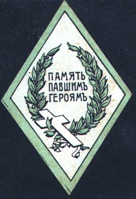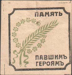 1916 1916(?) г. Ромб разм. 43 х 64 мм. Двухцветная печать на плотной белой бумаге. В рамке в форме ромба разм. 38 х 56 мм венок и четырехконечный крест. В центре венка текст в три строки: «Память павшим героям».