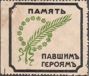 1916 1916(?) г. Разм. рамки 41 х 38 мм. Двухцветная печать на белой бумаге. Зубц. 11 1/2. В рамке в центре слева венок и лавровая ветвь. Сверху текст: «Память». Справа внизу продолжение текста в две строки: «Павшим героям». По углам знака разграничительные линии.