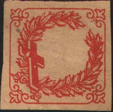 1916 1916(?) г. Ромб с разм. рамки 45 х 45 мм. Одноцветная печать на желтоватой бумаге. В декоративной рамке венок и четырехконечный крест. По углам знака разграничительные линии.