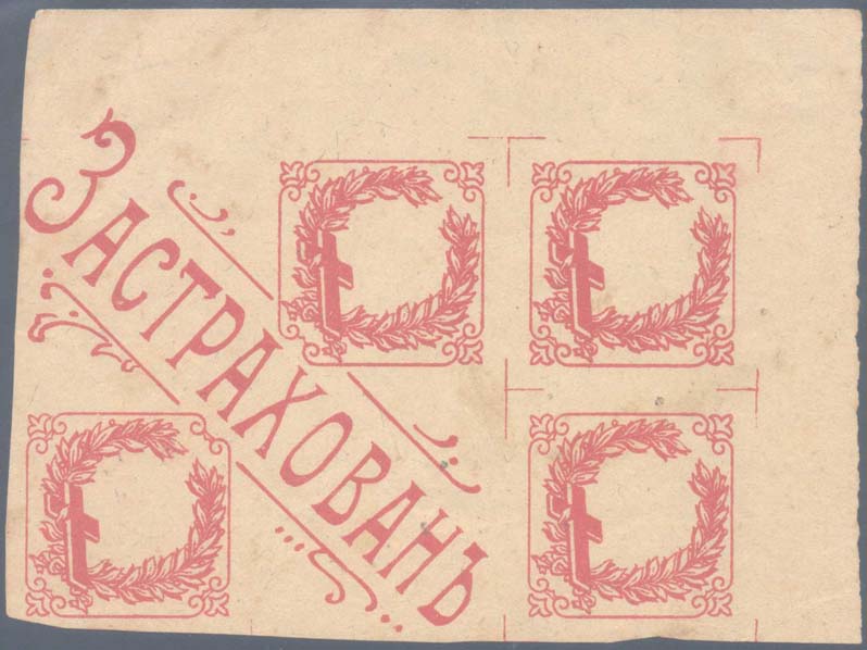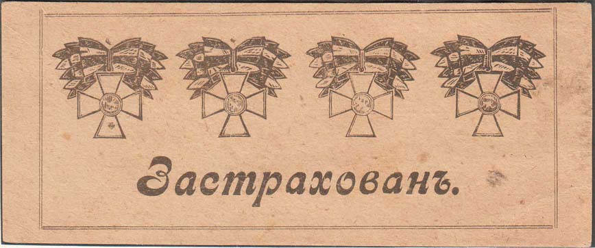 1916 1916(?) г. Листок разм. рамки 129 х 54 мм. Одноцветная печать на толстой желтоватой бумаге. В двойной прямоугольной рамке разм. 127 х 53 мм в центре четыре георгиевских креста на лентах. Внизу текст: «Застрахован».