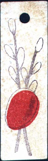 1916 1916(?) г. Разм. 26 х 88 мм. Двухцветная печать на толстой желтоватой бумаге. Две скрещенные ветки вербы и пасхальное яйцо.