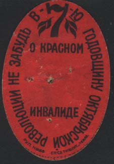 1924 1924 г. Овал разм. 36 х 54 мм. Двухцветная печать на белой бумаге со сплошным фоном на лицевой стороне. По окружности овала текст: «В 7-ю годовщину октябрьской революции не забудь». В центре продолжение текста в две строки: «О красном инвалиде». Внизу полукругом выходные данные мелким шрифтом: «Руп. №1868 ЕК-СЛ. Типолит. 7-8 мая».