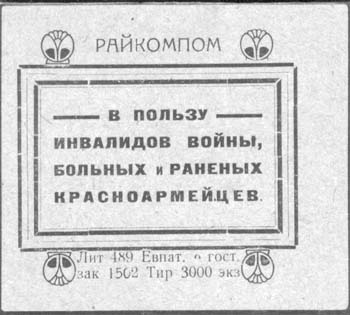 1925 1925(?) г. Разм. 67 х 59 мм. Одноцветная печать на розовой бумаге. В двойной прямоугольной рамке разм. 54,5 х 36 мм в центре текст в четыре строки: «В пользу инвалидов войны, больных и раненых красноармейцев». По углам рами снаружи декоративные элементы. Сверху над рамкой текст в одну строку: «Райкомпом». Внизу под рамкой выходные данные в две строки: «Лит. 489 Евпат. 6 гост. Зак. 1502. Тир. 3000 экз.».