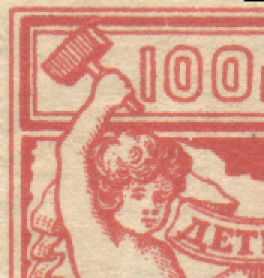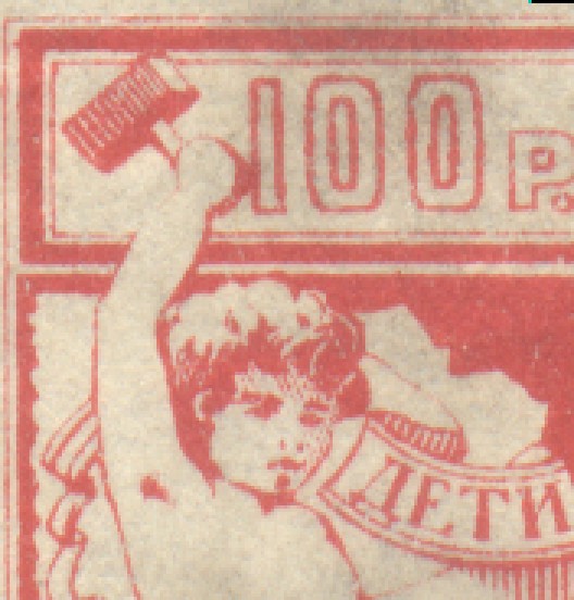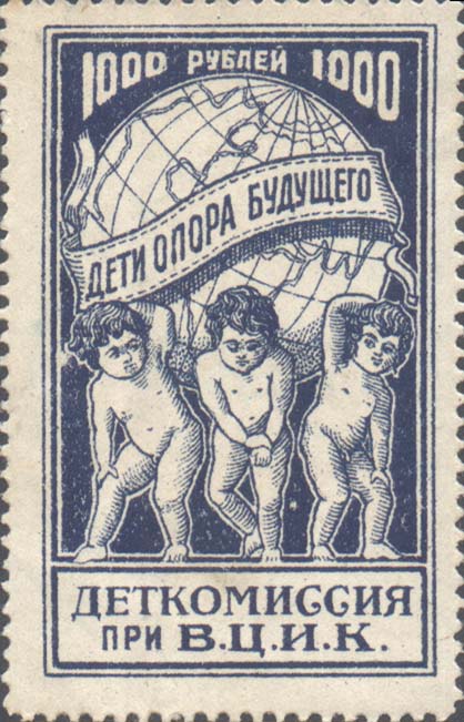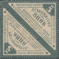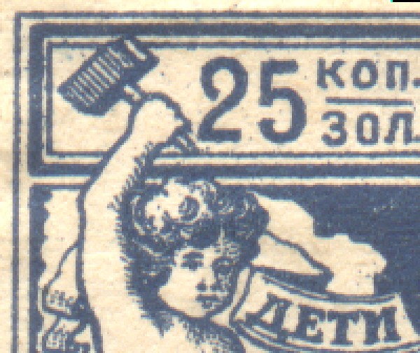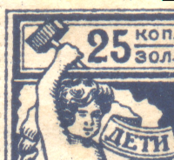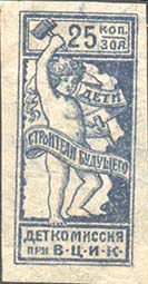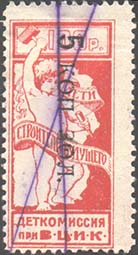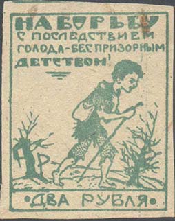1923 1923 г. Февраль. Разм. рамки 38,5 х 48,5 мм. Одноцветная печать на желтоватой бумаге. В центре в прямоугольной рамке в центре беспризорный ребенок. Сверху текст в четыре строки: «На борьбу с последствием голода – беспризорным детством». Внизу номинал прописью.