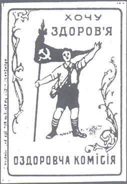 1927 1927 г. Разм. 42 х 60 мм. Двухцветная печать на плотной белой бумаге. В центре в прямоугольной рамке разм. 39 х 56 мм с закругленными краями пионер с флагом в правой руке. Сверху текст в две строки на украинском языке: «Хочу здоровья». Внизу текст: «Оздоровительная комиссия». Слева вертикально выходные данные мелким шрифтом неразборчиво.