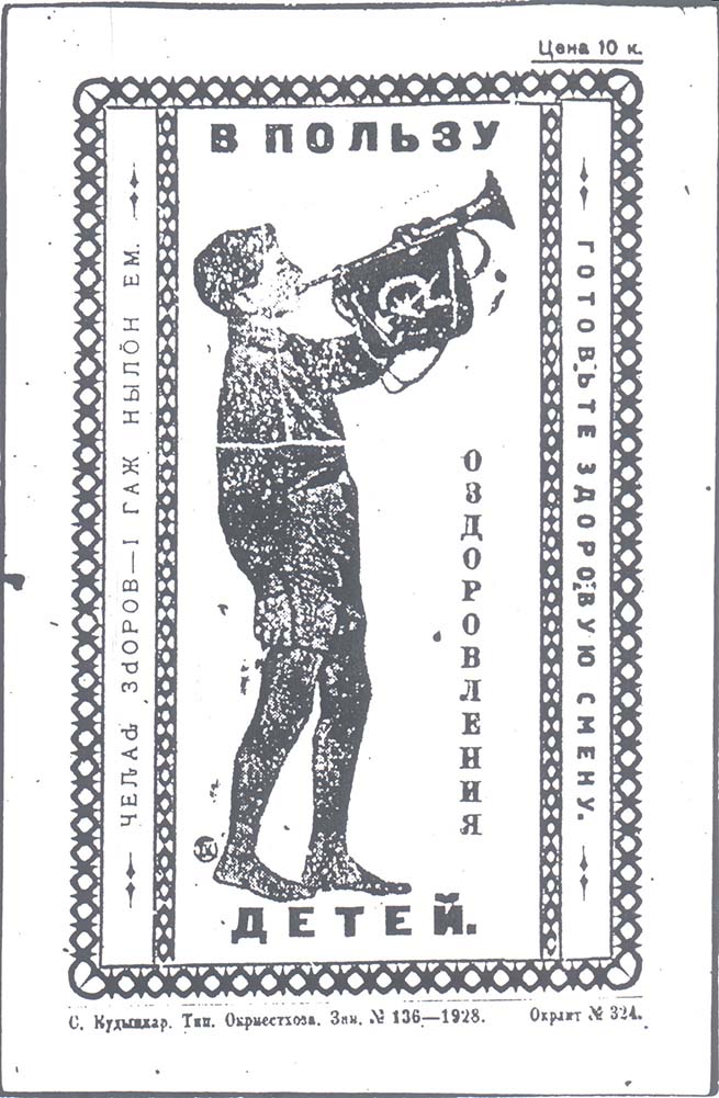 1928 1928 г. Листок разм. 112 х 171 мм. Одноцветная печать на толстой белой бумаге. В центре в прямоугольной декоративной рамке разм. 90 х 145 мм пионер с горном. По внутреннему периметру рамки текст: «В пользу оздоровления детей». Слева вертикально текст на местном языке. Справа вертикально сверху вниз текст: «Готовьте здоровую смену». Внизу под рамкой мелким шрифтом выходные данные: «С. Кудымкар. Тип. окрместхоза. Зак. №136-1928. Окрлит №342». Справа сверху над рамкой номинал с подчеркиванием: «Цена 10 к.».