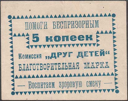 1924 1924 г. Разм. 68 х 54 мм. Одноцветная печать на белой плотной бумаге. В центре в прямоугольной рамке разм. 57 х 42 мм из треугольников текст в две строки: «Комиссия «Друг детей» благотворитель-ная марка». Сверху текст в две строки: «Помоги безработным 5 копеек». Внизу текст: «Воспитаем здоровую смену». На оборотной стороне фиолетовый оттиск круглой печати.