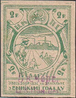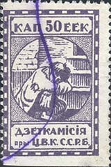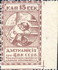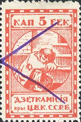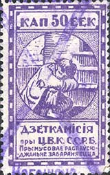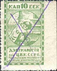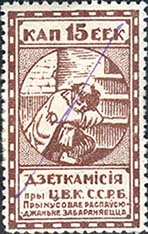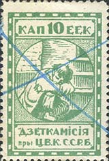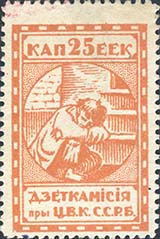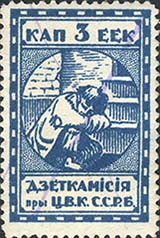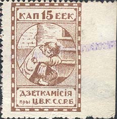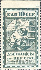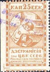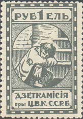 1924 1924 г. Первый республиканский выпуск. Разм. рамки 23 х 36,5 мм. Одноцветная печать на белой (оттенки) бумаге. Зубц. 11 1/2. С клеем. В центре беспризорный ребенок, сидящий на ступенях. Сверху номинал, внизу текст в две строки на белорусском языке: «Деткомиссия при Ц.И.К. С.С.Р.Б.».