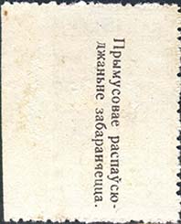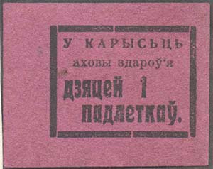 1924 1924(?) г. Разм. 49 х 39 мм. Одноцветная печать на темно-розовой бумаге. В центре в толстой прямо-угольной рамке разм. 35 х 27 мм текст на белорусском языке в четыре строки: «В пользу охраны здоровья детей и подростков».