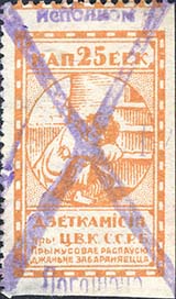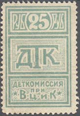 1925 1925 г. Пятый всероссийский выпуск. Марка в виде треугольника с разм. рамки 46 х 24 мм. Одноцветная печать на белой бумаге. Зубц. 10, 10 1/2, 12 1/2, 13 и их комбинации. С клеем. В центре в треугольной рамке текст в четыре строки: «Деткомиссия при ВЦИК. Благотворительная марка». Сверху номинал. По периметру рамки текст: «Принудительное распространение воспрещается и не подлежит приему и выдаче взамен дензнаков».