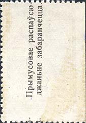 1924 1924 г. Второй республиканский выпуск. Разм. рамки 23 х 36,5 мм. Одноцветная печать на белой (оттенки) бумаге. Зубц. 11 1/2. С клеем. Рисунок предыдущего выпуска, но внизу добавлен текст на белорусском языке: «Принудительное распространение воспрещается».