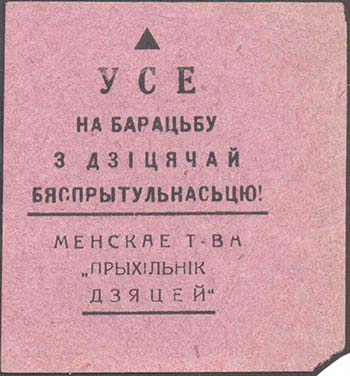 1924 1924(?) г. Разм. 58 х 62 мм. Одноцветная печать на серо-фиолетовой бумаге. В центре сверху текст в четыре строки на белорусском языке: «Все на борьбу с детской беспризорностью!». Внизу текст в три строки на белорусском языке под чертой: «Минское об-во «Друг детей»».