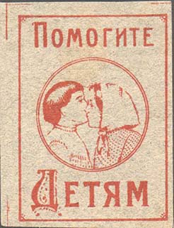 1923 1923 г. Разм. 42 х 55 мм. Одноцветная печать на тонкой сероватой бумаге низкого качества. В центре в прямоугольной рамке разм. 35,5 х 48,5 мм двойная круглая рамка диаметром 27 мм. В круглой рамке целующиеся дети. Текст: «Помогите детям».