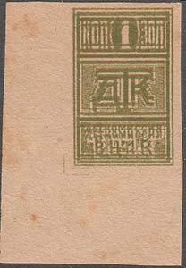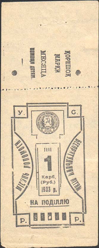 1923 1923 г. Листок из квитанционной книжки разм. 56 х 89 мм. Разм. талона 56 х 50 мм. Одноцветная пе-чать на желтоватой бумаге. Сверху односторонняя зубцовка Зубц. 11 1/2. В центре в двойной декоративной рамке сложной формы в дополнительной прямоугольной рамке номинал и дата 1923 г. Сверху герб УССР. По углам рамки буквы аббревиатуры «УССР». Текст на украинском языке: «Месяц помощи беспризорным детям на Подолии». На талоне текст в четыре строки: «Корешок марки месяца помощи детям».