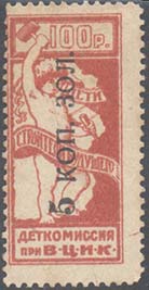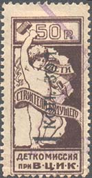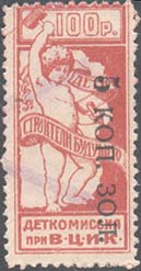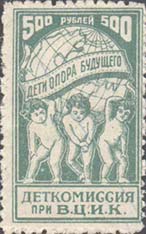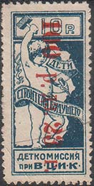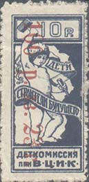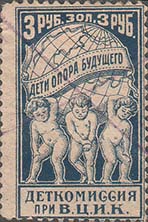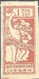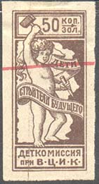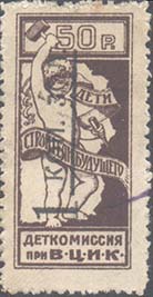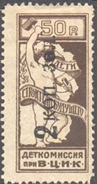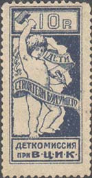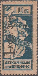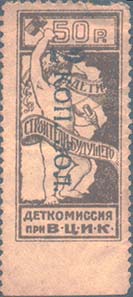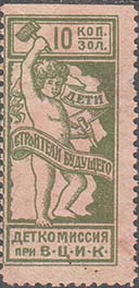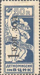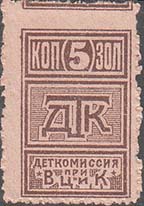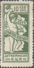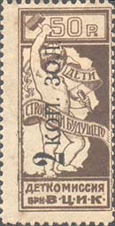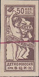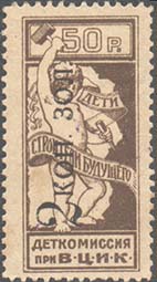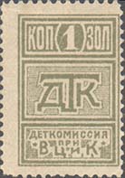 1923 1923 г. Октябрь Первый всероссийский выпуск. Одноцветная печать на белой (оттенки) бумаге. Зубц 11 1/2. С клеем. Внизу текст в две строки: «Деткомиссия при В.Ц.И.К.». Существуют три типа клише.