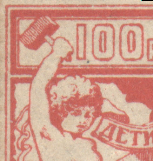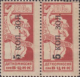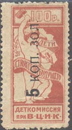 1923 1923 г. Второй вспомогательный всероссийский выпуск. Красная надпечатка нового номинала в виде вертикального текста «100 р. дз. 23 г.» на марке первого выпуска номиналом 10 к.