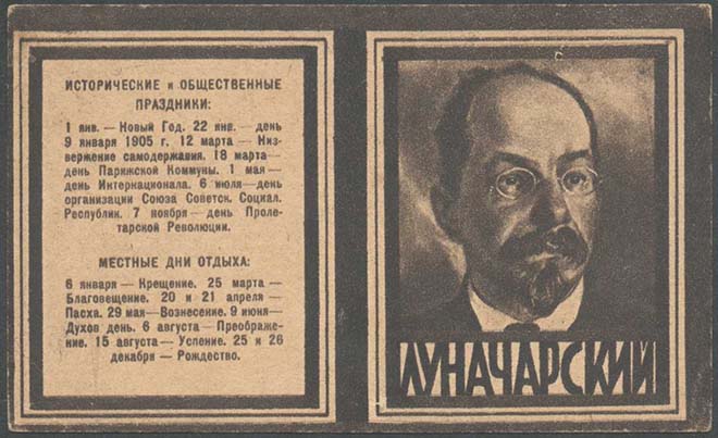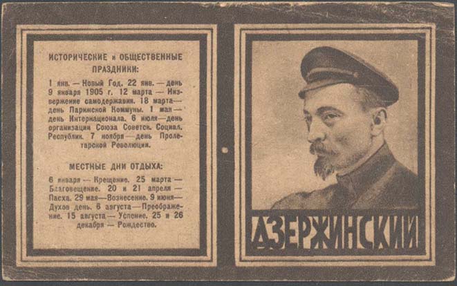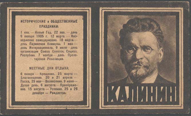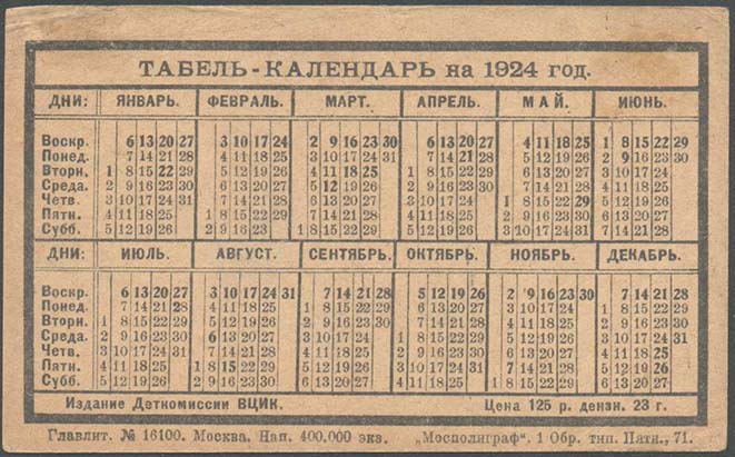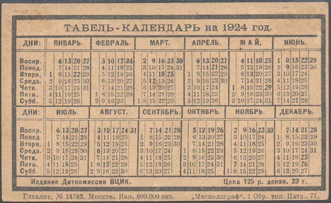 1923 1923 г. Листок разм. 111 х 65 мм. Двухцветная двухсторонняя печать на светло-желтой бумаге. На лицевой стороне в тройной рамке разм. 48 х 60 мм сверху перечень исторических и общественных праздников. Внизу перечень местных дней отдыха. Справа тройной рамке разм. 48 х 60 мм портрет государственного деятеля. Внизу под портретом поясняющая надпись. На оборотной стороне в толстой прямо-угольной рамке разм. 105 х 59 мм календарь на 1924 г. Сверху текст: «Табель-календарь на 1924 г.». Внизу текст: «Издание Деткомиссии ВЦИК. Цена 125 р. дензнак. 23 г.». Внизу под рамкой мелким шрифтом выходные данные: «Главлит. №14782. Москва. Нап. 600.000 экз. «Мосполиграф» 1 Обр. тип. Пятн., 71».