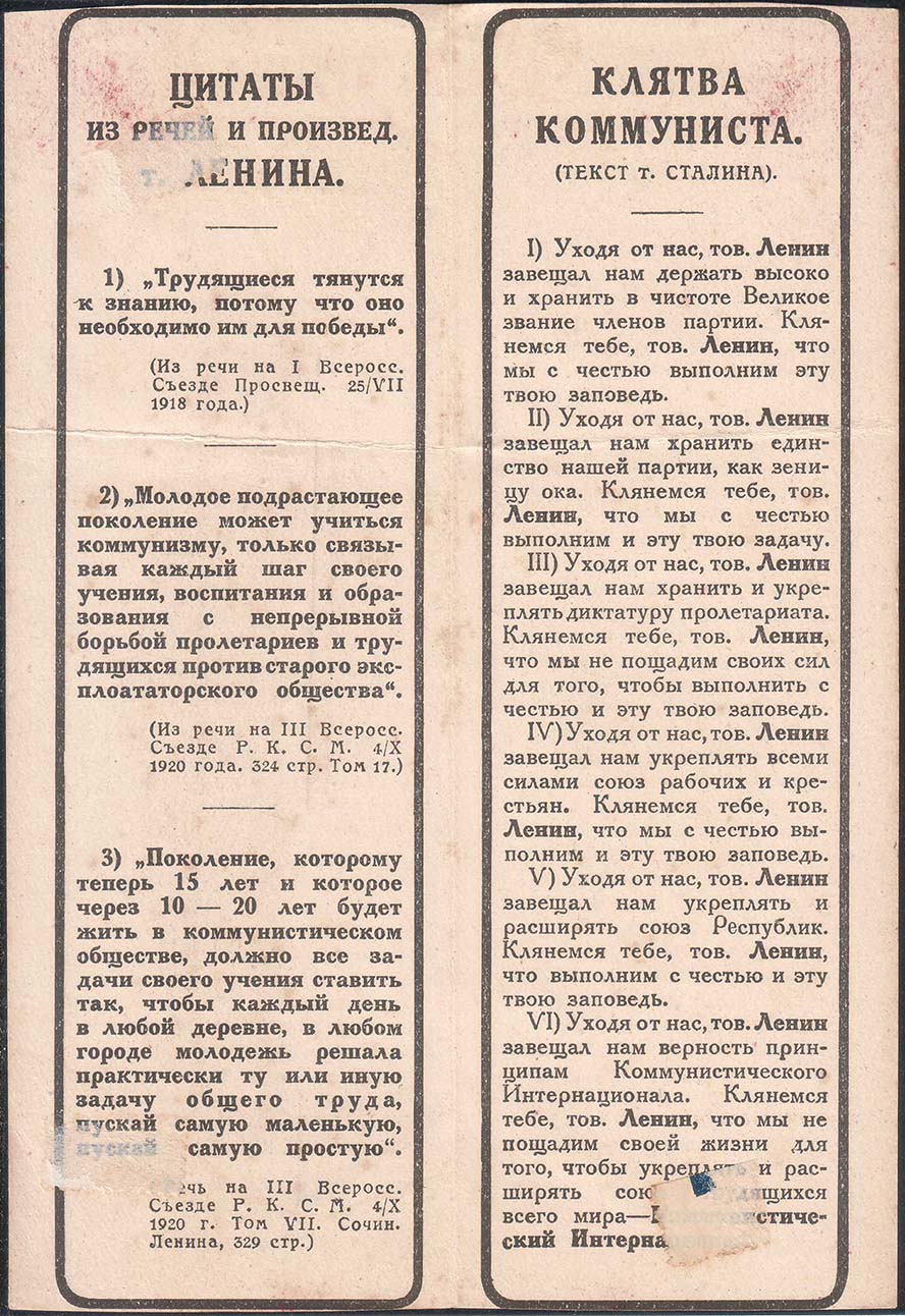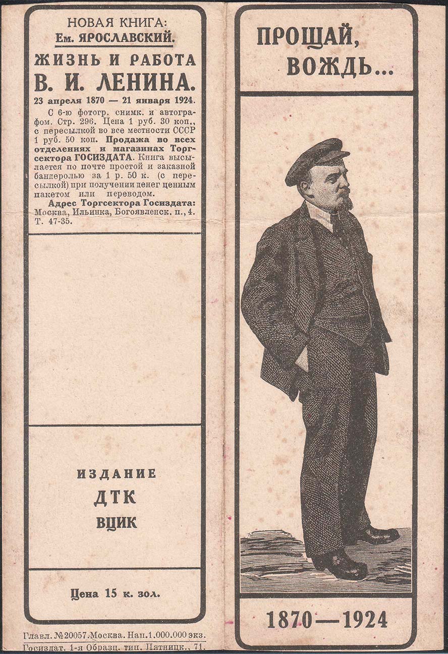 1924 0 г. 1924 Листок разм. 112 х 163 мм. Одноцветная двухсторонняя печать на толстой белой бумаге. На лицевой стороне слева в прямоугольной рамке с закругленными краями разм. 47 х 156 мм сверху текст в восемнадцать строк: «Новая книга: Ем. Ярославский. Жизнь и работа В.И.Ленина. 23 апреля 1970 – 21 января 1924. С 6-ю фотогр. с ним. И автографом. Стр. 269. Цена 1 руб. 30 коп., с пересылкой во все местности СССР 1 руб. 50 коп. Продажа во всех отделениях и магазинах Торгсектора ГОСИЗДАТА. Книга высылается по почте простой и заказной бандеролью за 1 р. 50 к. (с пересылкой) при получении денег ценным пакетом или переводом. Адрес Торгсектора Госиздата: Москва, Ильинка, Богоявленск. П. 4. Т 47-35». Ниже текст в три строки: «Издание ДТК ВЦИК». Ниже номинал: «Цена 15 к. зол.». Внизу под рамкой выходные данные мелким шрифтом: «Главл. №20057. Москва. Нап. 1.000.000 экз. Госиздат. 1-я Образц. Тип. Пятницк., 71». Справа в прямоугольной рамке с закругленными краями разм. 46 х 651 мм портрет В.И. Ленина в полный рост. Сверху текст в две строки: «Прощай вождь...». Внизу текст: «1870-1924». На оборотной стороне слева в прямоугольной рамке с закругленными краями разм. 47 х 162 мм цитаты из произведений В.И.Ленина. Справа в прямоугольной рамке с закругленными краями разм. 47 х 162 мм клятва коммуниста.