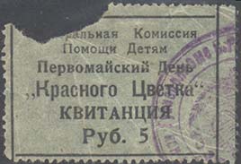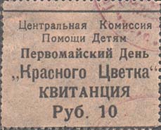 1923 1923(?) г. Разм. по перфорации 39 х 31 мм. Одноцветная печать на тонкой бумаге различных цветов. Зубц. 11 1/2. Сверху текст в две строки: «Центральная Комиссия Помощи Детям». В центре текст три строки: «Первомайский День «Красного цветка» Квитанция Руб. ...». На лицевой стороне фрагмент оттиска круглой печати фиолетового цвета.