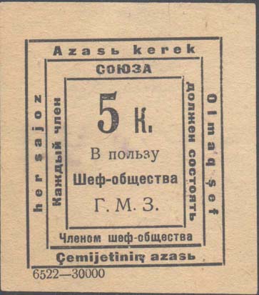 1932 1932 г. 25.09.1932 г. Разм. 61 х 68 мм. Одноцветная печать на желтоватой бумаге. В центре в тройной прямо-угольной рамке разм. 47 х 54 мм текст в четыре строки: «5 к. в пользу Шеф-общества Г.М.З.». По периметру между рамками текст на русском и татарском (латинской шрифтом) языках: «Каждый член союза должен состоять Членом шеф-общества». Внизу под рамкой слева выходные данные: «6522-30000». На оборотной стороне фиолетовый оттиск круглой контрольной печати диаметром 43 мм с неразборчивым текстом.