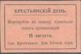 1917 1917 г. 15.08.1917 г. Разм. 68 х 42 мм. Одноцветная печать на кирпично-красной бумаге. В прямоугольной рамке разм. 54 х 33 мм в центре текст в три строки: «Жертвуйте в пользу крестьянских организаций 15 августа». Сверху текст: «Крестьянский день». Внизу текст: «Сов[ет]. Крестьянск[их]. Деп[утатов]. Киевск[ого]. Гарн[изона].».