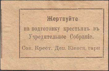 1917 1917 г. Разм. 59 х 38 мм. Одноцветная печать на тонкой сероватой бумаге. В центре в прямоугольной рамке разм. 46 х 27 мм текст в три строки: «Жертвуйте на подготовку крестьян в Учредительное Собрание». Внизу текст: «Сов[ет]. Крест[ьянских]. Деп[утатов]. Киевск[ого]. Гарн[изона].».