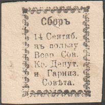 1919 1919 г. 14.09.1919 г. Одноцветная печать на толстой сероватой бумаге. В декоративной рамке разм. 22 х 29 мм в центре текст в семь строк: «Сбор 14 Сентяб[ря]. в пользу Всер[оссийского]. Сов[ета]. Кр[естьянских]. Депут[атов]. и гарниз[онного]. Совета».