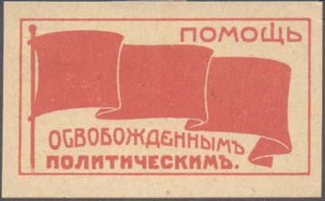 1917 1917 г. Разм. 60 х 37 мм. Одноцветная печать на плотной желтоватой бумаге. В центре в прямоугольной рамке разм. 54 х 29 мм красный флаг со складками. В правом верхнем углу текст: «Помощь». Внизу продолжение текста в две строки: «Освобожденным политическим».