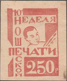 1923 1923 г. Разм. 44 х 53 мм. Одноцветная печать на тонкой желтоватой бумаге. Разм. рис. 34 х 45 мм. В центре в декоративной рамке молодой человек читает газету. По периметру текст: «Неделя юношеской печати». В правом нижнем углу номинал.