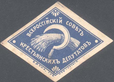 1917 1917 г. 15.08.1917 г. Ромб разм. 74 х 53 мм. Одноцветная печать на плотной белой бумаге. В рамке в форме ромба разм. 63 х 45 мм на сплошном фоне серп и сноп пшеницы. Сверху полукругом текст: «Всероссийский совет». Внизу полукругом продолжение текста: «Крестьянских депутатов». По внутренним углам рамки декоративные элементы. Внизу по наружному периметру рамки выходные данные мелким шрифтом: «Вятка, Губ. Типо-литогр.».