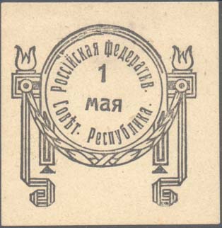 1920 1920(?) г. Разм. 52 х 54 мм. Одноцветная печать на плотной белой бумаге. В центре в круглой рамке со сложным геометрическим орнаментом текст в две строки: «1 мая». По внутреннему периметру рамки текст: «Российская Федератив[ная]. Совет[ская]. Республика».