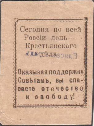 1917 1917 г. 15.08.1917 г. Разм. 51 х 68 мм. Одноцветная печать на тонкой серой бумаге. В прямоугольной декоративной рамке разм. 41 х 49 мм в центре декоративный элемент в виде двух штрихов. Сверху текст в четыре строки: «Сегодня по всей России день – Крестьянского дела». Внизу текст в четыре строки: «Оказывая поддержку Советам, вы спасаете отечество и свободу!».
