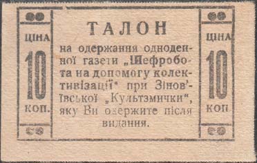 1932 1932 г. Разм. 62 х 39 мм. Одноцветная печать на толстой кремовой бумаге. Мелкая нерегулярная просечка. В прямоугольной рамке разм. 53 х 32 мм в центре текст в восемь строк на украинском языке: «Талон на приобретение однодневной газеты «Шефработа на помощь коллективизации» при Зиновьевской «Культсмычке», которую Вы получите после выпуска». Слева и справа в отдельных рамках номинал.