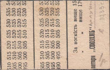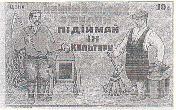 1931 1931 г. Листок разм. 139 х 89 мм. Трехцветная печать на толстой бледно-желтой бумаге. В двойной прямоугольной рамке разм. 134 х 83 мм крестьянин с косой возле трактора и рабочий с молотом возле наковальни. Между ними в пять строк текст на украинском языке: «Крепите смычку с селом. Поднимай их культуру». Сверху номинал: «Цена 10 к.». Слева внизу под рамкой выходные данные неразборчиво.