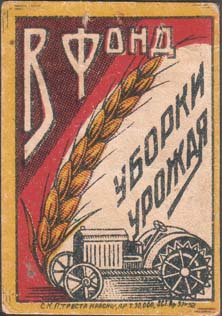 1929 1929(?) г. Разм. 37 х 58 мм. Трехцветная печать на кремовой бумаге. В прямоугольной рамке разм. 33,5 х 43 мм в центре колос, трактор и текст в три строки: «В фонд уборки урожая». Под рамкой выходные данные мелким шрифтом: «СКП треста Краснодар т.30.000 ОСТ. Ар 37 х 52».
