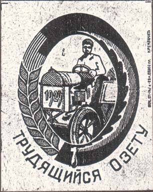 1929 1929 г. Разм. 51 х 63 мм. Одноцветная печать на желтоватой бумаге. В двойной овальной рамке разм. 41 х 51 мм из серпа и колоса тракторист на тракторе с датой на радиаторе «1929». Внизу под рамкой полукругом текст: «Трудящийся Озету». Справа вертикально выходные данные мелким шрифтом: «Окрл. 171-76/ а-29 г. 20000 экз. Кремпепчать».