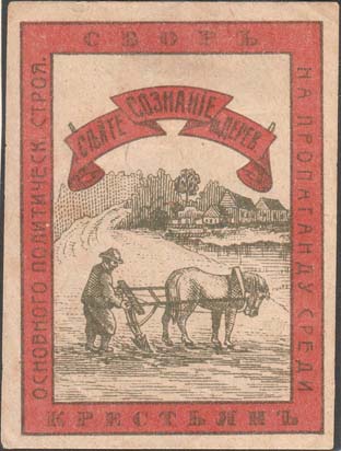 1922 1922(?) г. Разм. 52 х 69 мм. Двухцветная печать на бежевой бумаге. В двойной прямоугольной рамке разм. 47 х 63 мм пахарь на фоне деревни. Сверху лента с текстом: «Сейте сознание в дерев[не].». По периметру между рамками текст: «Сбор на пропаганду среди крестьян основного политическ[ого]. строя».