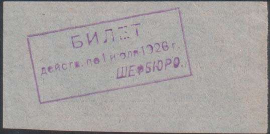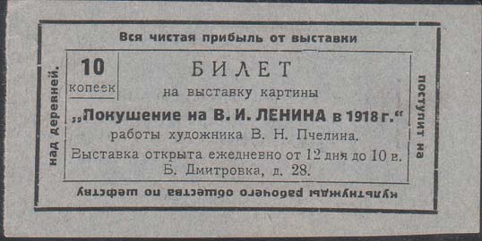 1926 1926 г. Разм. 89 х 44 мм. Одноцветная печать на серо-синей бумаге. В двойной прямоугольной рамке разм. 76 х 35 мм текст в шесть строк: «Билет на выставку картин «Покушение на В.И.Ленина в 1918 г.» работы художника В.Н.Пчелина. Выставка открыта ежедневно от 12 дня до 10 в[ечера]. Б[ольшая]. Дмитровка, д[ом]. 28». В левом верхнем углу номинал в прямоугольной рамке. По периметру между рамками текст: «Вся чистая прибыль от выставки поступит на культнужды рабочего общества по шефству над деревней». На оборотной стороне фиолетовый оттиск прямоугольного штампа разм. 53 х 24 мм с текстом в три строки: «Билет действ[ителен]. По 1 июля 1926 г. Шефбюро».