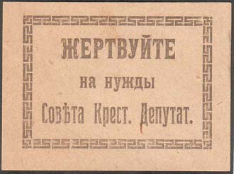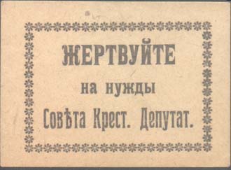 1917 1917(?) г. Разм. 56 х 40 мм. Одноцветная двухсторонняя печать на желтоватой бумаге. На лицевой и оборотной стороне в центре в прямоугольных декоративных рамках разм. 45 х 31,5 мм текст в три строки: «Жертвуйте на нужды Совета Крест[ьянских]. Депутат[ов].».